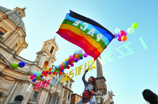 4月2日,在意大利罗马纳沃纳广场,一名儿童在反战集会上挥舞象征和平的彩虹旗。当天,大批民众在罗马参加反战集会,反对西方国家军事干预利比亚。
