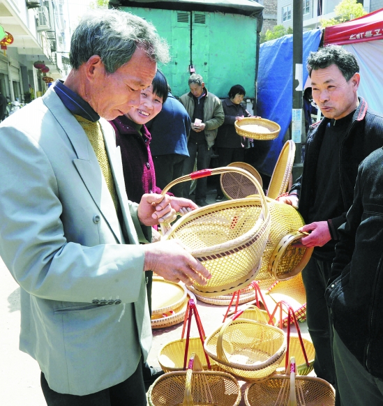 | 在东阳乡村,竹编器物是女儿出嫁必备嫁妆,也是日后一家人的日常生活用品。随着社会生活方式的改变,塑料用品大行其道,但纯手工精细制作的竹制品仍受青睐。图为东阳市村民日前在画水镇物资交流会上选购传统竹编陪嫁用品。 包康轩 摄 |