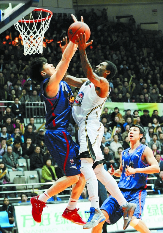 4月6日,新疆广汇队球员杜比(中)在比赛中上篮。当日,在新疆乌鲁木齐进行的2010-2011赛季中国男子篮球职业联赛(CBA)半决赛第二轮的比赛中,新疆广汇队主场以112比91胜江苏国信地产队,另一场比赛,广东队以123比115胜东莞队。新华社发