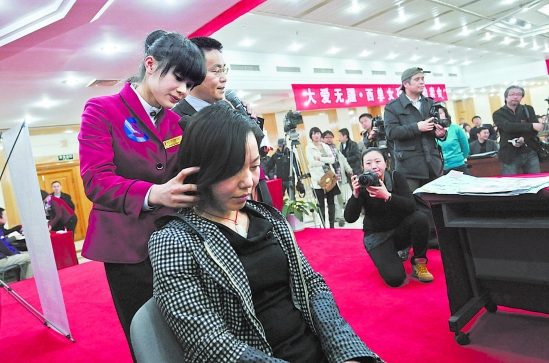 大学生严丹在拍卖会上展示服务技艺。 新华社记者 张宇 摄