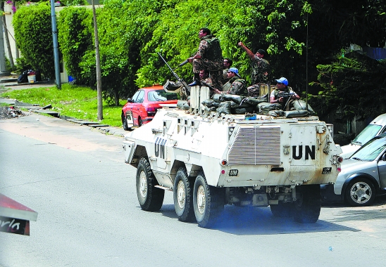 4月6日,在科特迪瓦经济首都阿比让,联合国维和车辆在街头巡逻。