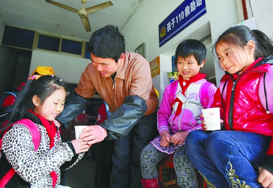 “孩子110救助站”的安全志愿者赵忠良给小朋友倒水喝。