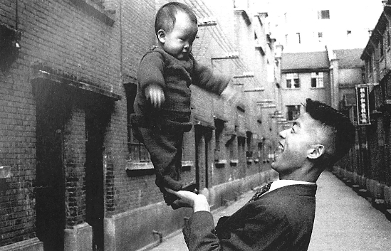 年轻的父亲逗着孩子,上海里弄的典型家庭生活。周海婴摄于1950年