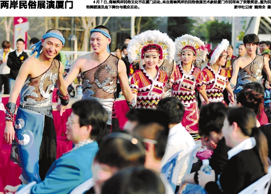 4月7日,海峡两岸民俗文化节在厦门启动,来自海峡两岸的民俗表演艺术家给厦门市民带来了欢歌笑语。图为民俗舞蹈演员走下舞台与观众互动。 新华社记者 魏培全 摄