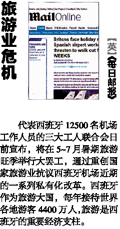 代表西班牙12500名机场工作人员的三大工人联合会日前宣布,将在5~7月暑期旅游旺季举行大罢工,通过重创国家旅游业抗议西班牙机场近期的一系列私有化改革。西班牙作为旅游大国,每年接待世界各地游客4400万人,旅游是西班牙的重要经济支柱。
