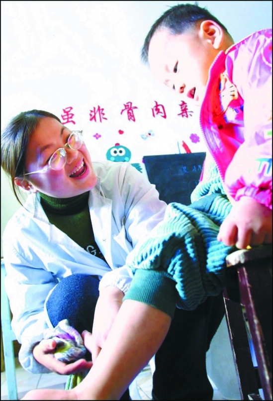 ↑ 廖云替孩子们洗脚。