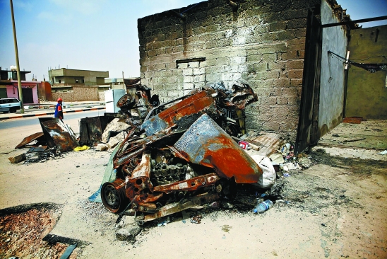 4月7日,在利比亚艾季达比耶,一名男孩走过一处被炸毁的汽车。艾季达比耶有“班加西门户”之称,在冲突中几度易手,城中十室九空。 新华社记者 才扬 摄