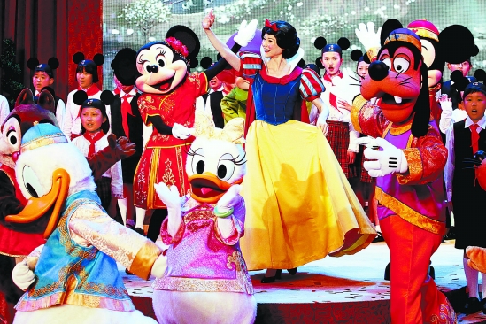 图为迪斯尼的经典动画人物与孩子们在开工典礼上同台演出。 本报记者 李震宇 摄