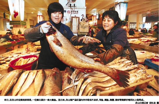 昨日,在舟山市定海南珍菜场,一位摊主展示一条大鮸鱼。连日来,舟山海产品在国内外市场供不应求,带鱼、鲳鱼、海蟹、海虾等海鲜价格同比上涨两成。