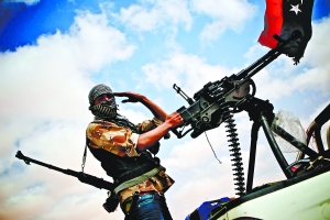 | 4月6日,在利比亚东部城市布雷加前线,一名反政府军重机枪手在出发前敬礼。 新华社记者 才扬 摄 |