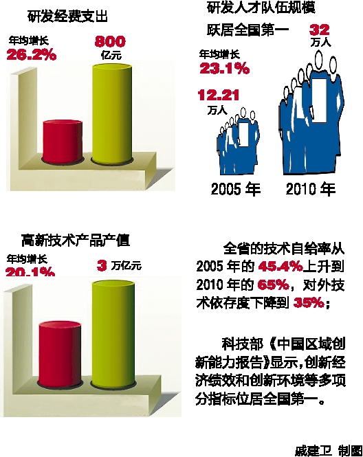 全省的技术自给率从2005年的45.4%上升到2010年的65%,对外技术依存度下降到35%;