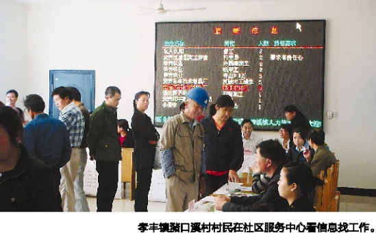 孝丰镇潴口溪村村民在社区服务中心看信息找工作。