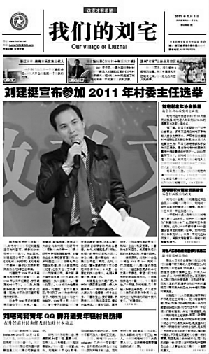 今年元旦,刘建挺自己印制的竞选海报出现在刘宅村,这份名为《我们的刘宅》的海报,头版头条内容是“刘建挺宣布参加2011年村委主任选举”。