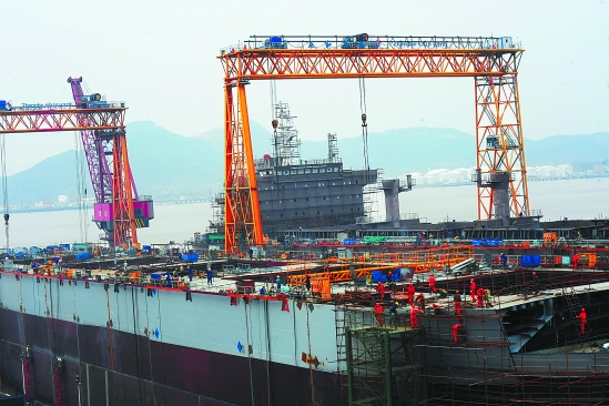 | “舟山群岛新区”建设提振了舟山市造船业。图为4月11日,在舟山的浙江正和造船有限公司船台上,工人们正在5.7万吨级散货船上紧张施工作业。该公司一季度已交船3艘,依靠技术创新,计划全年造船18艘,超过100万载重吨。记者 江勇 通讯员 徐丹 摄 |