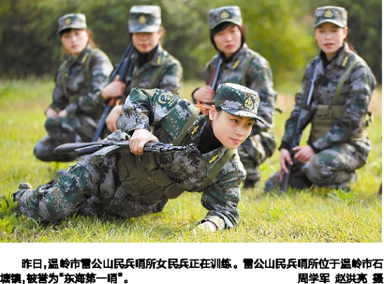 昨日,温岭市雷公山民兵哨所女民兵正在训练。雷公山民兵哨所位于温岭市石塘镇,被誉为“东海第一哨”。 周学军 赵洪亮 摄