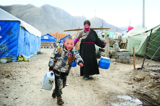 | 4月10日,青海省玉树藏族自治州结古镇下西同村,5岁的索南然丁(前)帮助母亲提水。 4月中旬的玉树,依然草木枯黄、气温较低。而玉树灾区的居住地,酥油茶飘香,人们脸上荡漾着笑容。自2010年6月20日灾后重建工作全面启动以来,玉树灾区开工建设农牧民住房11655户、城镇居民住房13667户,禅古、甘达、仲达、巴塘等村镇的部分农牧民已迁入新居。青海省民政部门自2010年9月初开始向灾区调拨过冬棉帐篷及各类生活物资。截至目前,累计发放各类补助资金8.32亿元,人均达到3730元,切实解决了受灾群众的生产生活困难。 新华社记者 张宏祥 摄 |