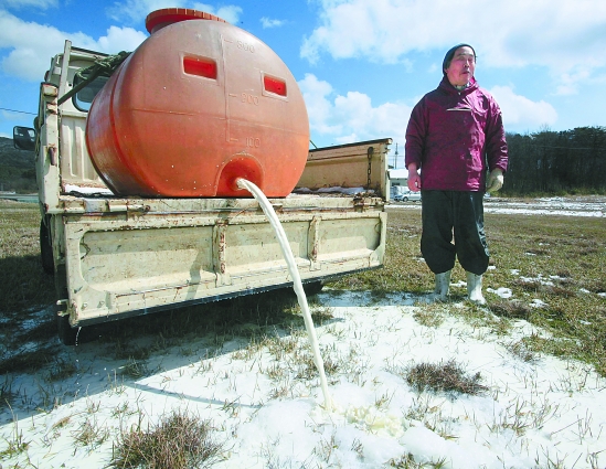 在日本福岛县的二本松市,无奈的奶农倾倒放射性物质超标的牛奶。新华社发