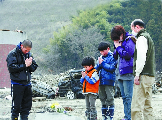 4月11日,在日本宫城县石卷市,一家人在自家住宅原址放上一束鲜花后默默祈祷。 新华社发