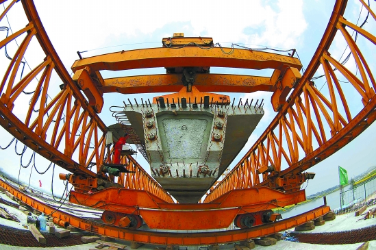 4月11日, 嘉绍高速陆地上最大的跨河大桥——长山河特大桥主桥正式合龙,标志着主桥已全面贯通,该桥长280米,桥面总宽40.50米。嘉绍高速是横跨杭州湾的第二条快速通道,它北起嘉兴秀洲区,途经海宁、海盐和上虞,全长69公里。王超英 摄