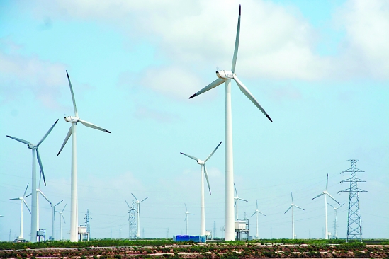 国家第一轮海上风电特许权招标项目完成后,盐城将建成“海上三峡”。图为大丰滩涂上的风力发电场。 陈同生 摄