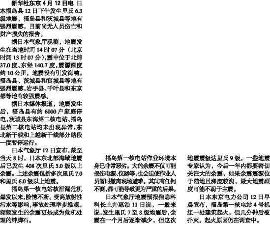 新华社东京4月12日电 日本福岛县12日下午发生里氏6.3级地震,福岛县和茨城县等地有强烈震感,目前尚无人员伤亡和财产损失的报告。