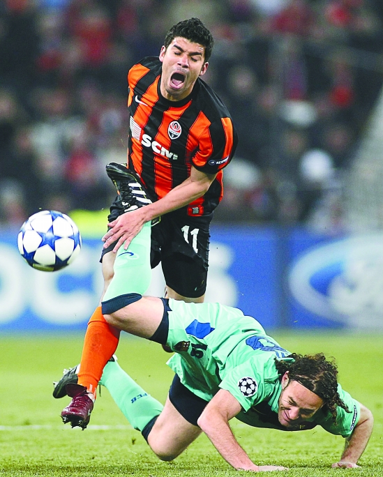 4月12日,巴萨队球员米利托(下)与矿工队球员爱德华多拼抢。 新华社发