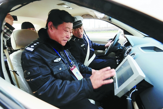 在杭州中村考场,两名警官正在试用智能路考系统。记者 李震宇 摄
