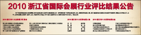 为了适应我省会展业发展需要,树立会展品牌,促进行业健康发展,进一步培育和推广优秀会展品牌、企业,表彰优秀会展人物,浙江省国际会议展览业协会经市地推荐、网络公示并按公正、公平、公开的原则,经初评、复评、公示、专家评审,评选出2010浙江会展行业三大榜单(排名不分主次)。特此公告