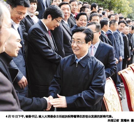 4月13日下午,省委书记、省人大常委会主任赵洪祝等看望在苏创业发展的浙商代表。