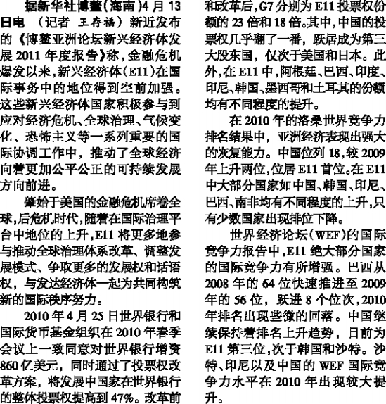 据新华社博鳌(海南)4月13日电 (记者 王存福) 新近发布的《博鳌亚洲论坛新兴经济体发展2011年度报告》称,金融危机爆发以来,新兴经济体(E11)在国际事务中的地位得到空前加强。这些新兴经济体国家积极参与到应对经济危机、全球治理、气候变化、恐怖主义等一系列重要的国际协调工作中,推动了全球经济向着更加公平公正的可持续发展方向前进。