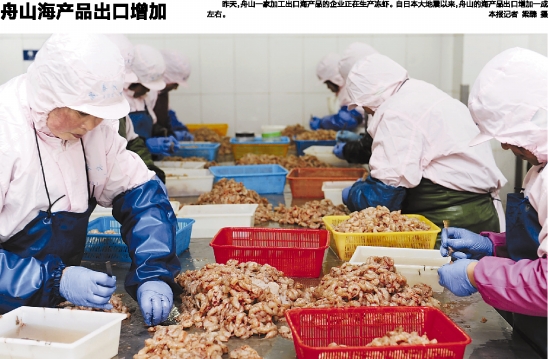 昨天,舟山一家加工出口海产品的企业正在生产冻虾。自日本大地震以来,舟山的海产品出口增加一成左右。本报记者 梁臻 摄