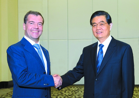 4月13日,国家主席胡锦涛会见俄罗斯总统梅德韦杰夫。 新华社记者 李学仁 摄