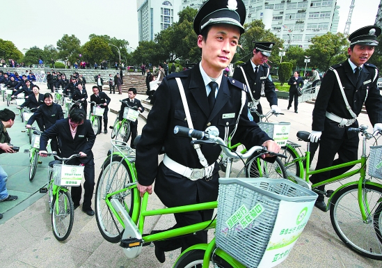 宁波市首批公共自行车大部分是办公楼宇配置的,主要供办公楼人员上班时免费使用。图为海曙区的物业企业代表在中山广场领取自行车。 胡建华 许玉芬 摄