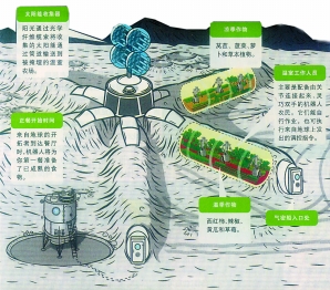 月球:建在月球地极区域的农场可采用来自陨石坑里的水冰,为免遭宇宙射线、微流陨星和极端温度的侵袭和损害,农场建筑结构采用掩埋式方法。