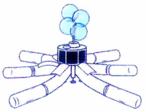 | 太空飞船将载着预先包装好的温室构架降落在月球上。然后展开的机械臂开始进行充气作业,膨胀后就形成温室种植场的外壳。此时,一台机器人推土机伸出一条手臂开始掩埋种植坊的结构组织。目的是保护它们免受辐射和微流陨星的侵袭。 |