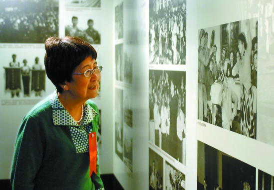 4月15日,清华大学百年校庆拉开帷幕。图为清华大学外语系校友,萧乾夫人、著名翻译家文洁若在校史展的老照片前驻足。新华社发