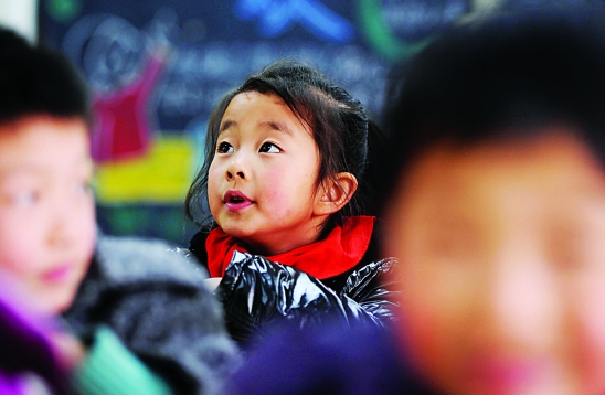 杭州公立的民工子弟学校天成小学的音乐课上,一名女孩认真听讲。据新华社
