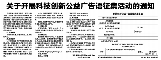 为贯彻落实科学发展观,深入实施“两创”总战略,进一步弘扬科学精神,普及科学知识,为建设创新型省份营造良好舆论氛围,在浙江省科技厅的支持下,浙江省科技新闻宣传工作者协会联合浙江在线、浙江科技报等媒体开展科技创新公益广告语征集活动,自即日起面向社会公开征集科技创新公益广告语。现将有关事项通知如下: