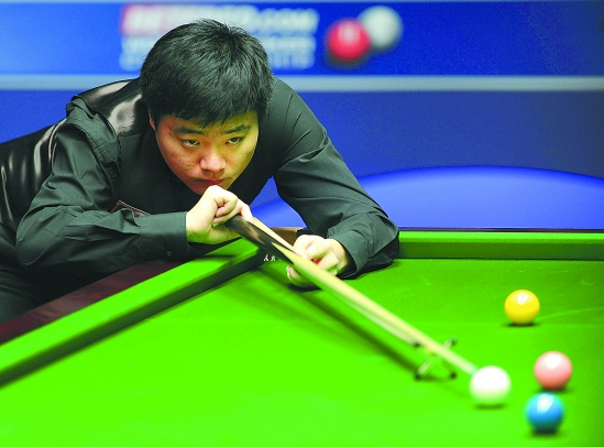 18日,在英国谢菲尔德举行的2011年斯诺克世锦赛首轮比赛中,中国选手丁俊晖以10比2击败苏格兰选手伯内特,晋级16强。图为中国选手丁俊晖在比赛中。