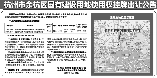 五、本次挂牌出让详细资料请参阅挂牌出让文件。有关挂牌出让文件资料可于2011年4月29日起到杭州市余杭区公共资源交易中心(余杭区临平南大街265号时代广场市民之家三楼)L8号窗口索取。