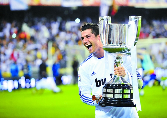 4月20日,皇马球员克·罗纳尔多手举国王杯欢呼庆祝。 新华社发
