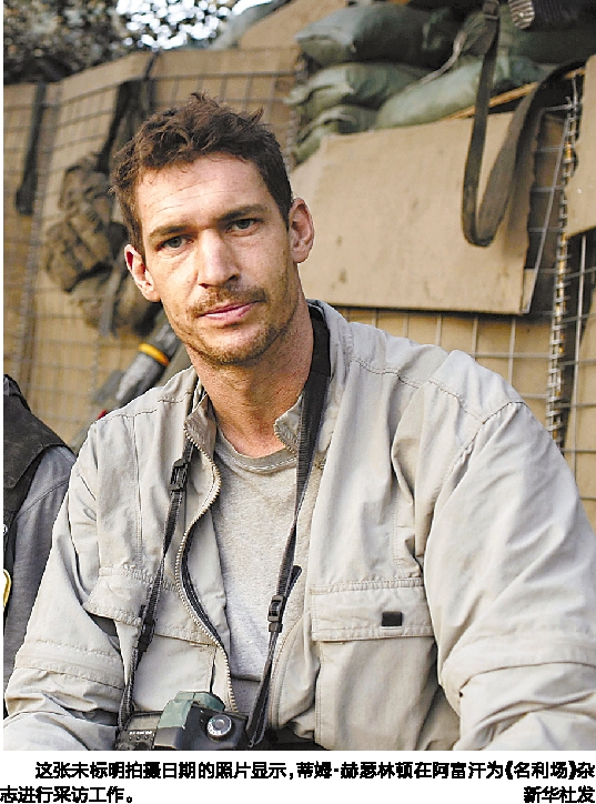 这张未标明拍摄日期的照片显示,蒂姆·赫瑟林顿在阿富汗为《名利场》杂志进行采访工作。 新华社发