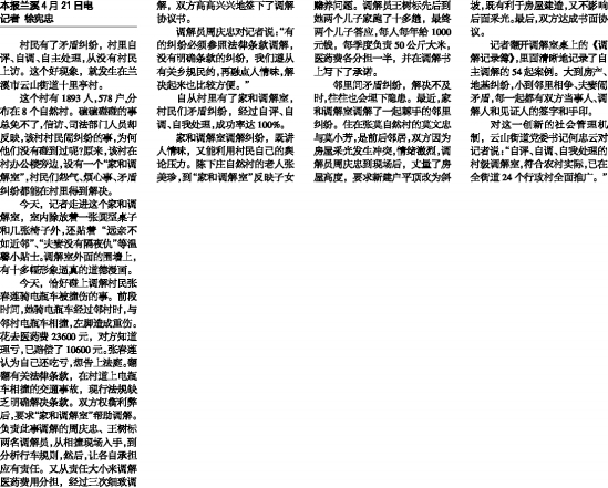调解员周庆忠对记者说:“有的纠纷必须参照法律条款调解,没有明确条款的纠纷,我们遵从有关乡规民约,再融点人情味,解决起来也比较方便。”