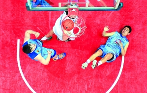 4月22日,广东东莞银行队球员王征(中)在比赛中上篮。当日,在2010-2011赛季中国男子篮球职业联赛(CBA)总决赛第四回合比赛中,广东东莞银行队主场以122比87击败新疆广汇汽车队,将总比分扳成2比2平。 新华社发