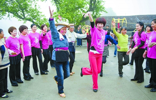 4月22日,景宁快乐广场健身队20多名队员进村送舞。她们还自筹资金,给该县梅山村的姐妹们送上一台学习跳舞的录音机和化妆用大礼包,希望把快乐带给住在山上的姐妹们。李肃人 摄
