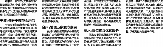 丽水市委组织部组织引导城乡党组织和广大党员开展“进万户、访民情、解民忧”、“送文艺送医疗下基层”和支农惠农服务活动,采取“党员服务一条街”、“奉献服务周”、“党员义工日”等形式,深入农村、社区、企业开展各项服务活动,以实际行动为党旗添光彩。广大党员在岗位亮身份,开展“岗位练兵”、“技能比武”、“业务竞赛”等活动,争当爱岗模范、敬业标兵、业务尖子。窗口单位和服务行业的党员带头改进服务态度、优化服务环境、提高服务质量,以模范行为起表率作用。