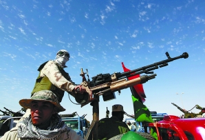 | 利比亚反政府武装人员在艾季达比耶附近地区站在一辆卡车上操纵高射机枪。 新华社发 |