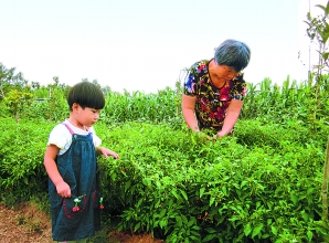 菜园实行分片播种,最外围种植玉米、小麦、南瓜、冬瓜,第二层种番薯、芋艿和茭白,最里层种需要精心呵护的时令蔬菜——番茄、黄瓜、辣椒还有韭菜、葱、蒜。菜园最中间种植从勾庄移植过来的铁树、桂花树、柳树和竹子。
