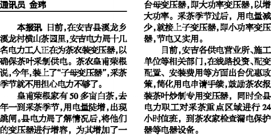 本报讯 日前,在安吉县溪龙乡溪龙村横山茶园里,安吉电力局十几名电力工人正在为茶农装变压器,以确保茶叶采制供电。茶农皇甫荣根说,今年,装上了“子母变压器”,采茶季节就不用担心电力不够了。
