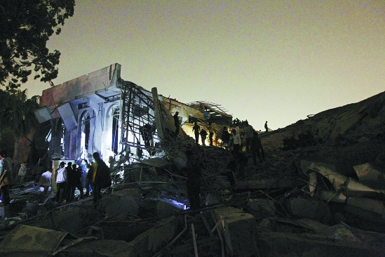 4月25日,利比亚安全人员查看被轰炸的卡扎菲官邸。 新华社发